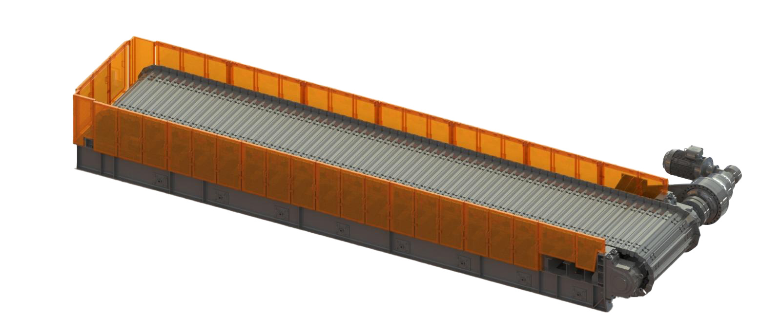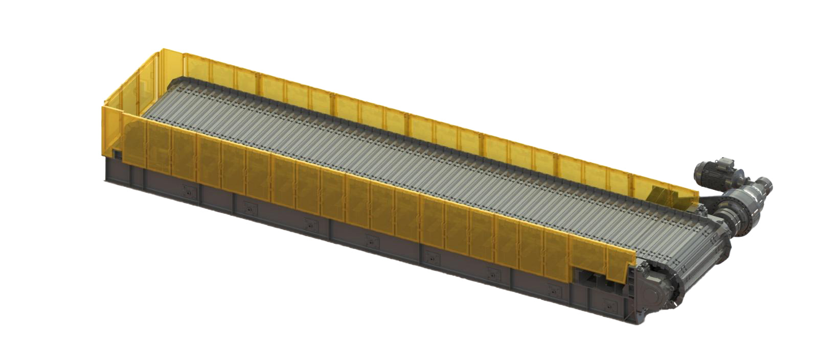 • At the discharge end, material is released either by gravity or onto an additional conveyor at a regulated rate. The capacity is determined by factors such as chain speed, pan width, and feed depth.