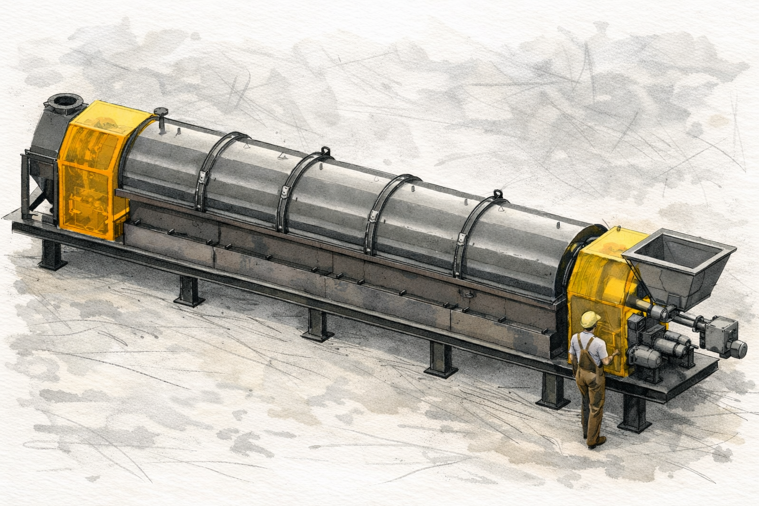 The kiln components (drum, liners, seals) must tolerate high temperatures, corrosive/abrading carbon, steam, and inert gas cycling. Design must allow access for maintenance and pre-empt wear.